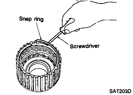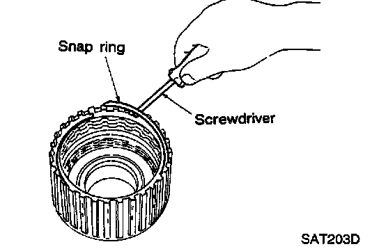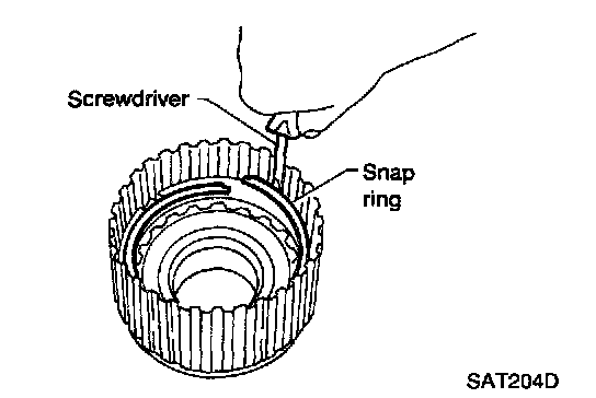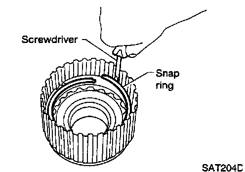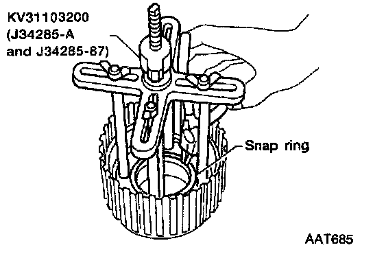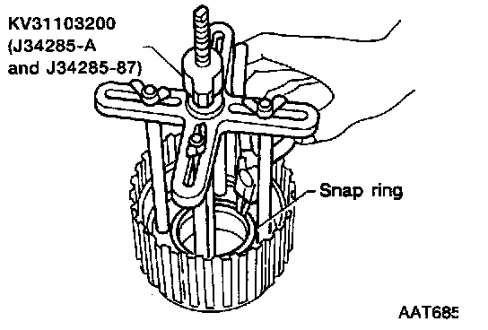 6. Set Tool on spring retainer and remove snap ring from forward clutch drum while compressing return springs.