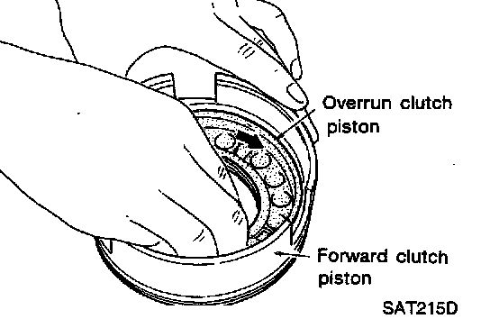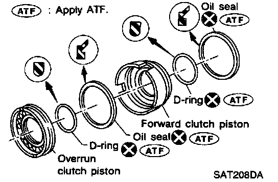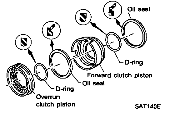 1. Install D-rings and oil seals on forward clutch piston and overrun clutch piston.