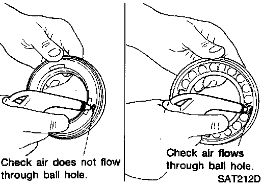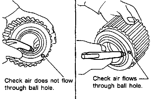 - Apply compressed air to check ball oil hole from outside of forward clutch drum. Make sure air leaks past ball.