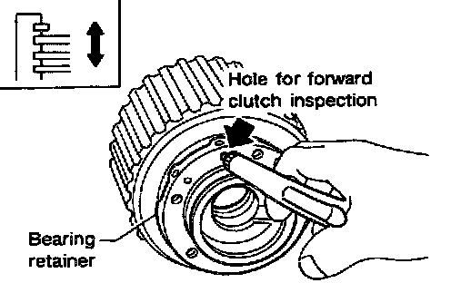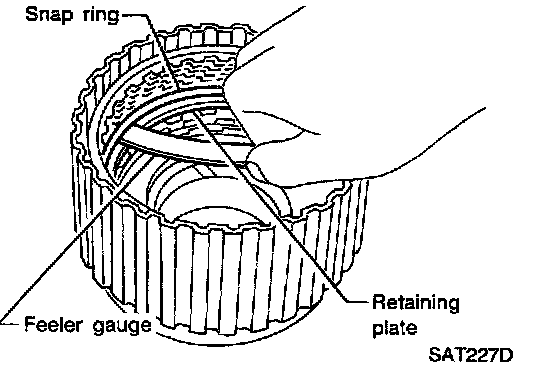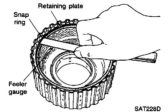 13. Measure clearance between forward clutch retaining plate and snap ring. If not within allowable limit, select proper retaining plate.