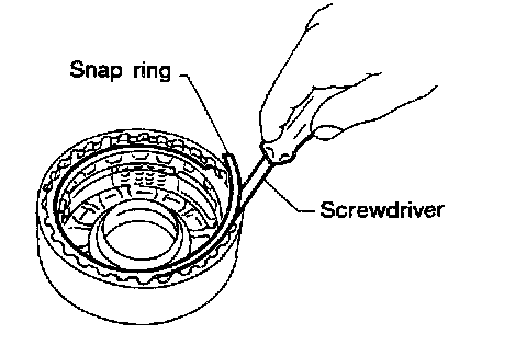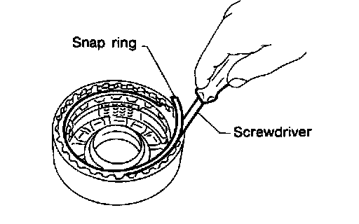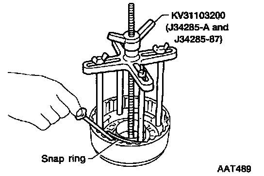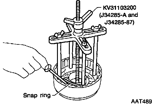 4. Set Tool on spring retainer and remove snap ring from reverse clutch drum while compressing return springs.