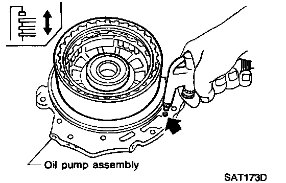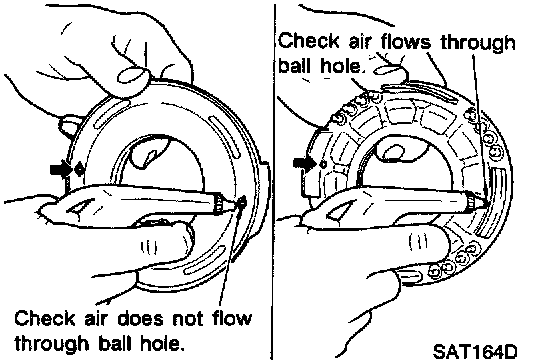 - Apply compressed air to oil hole on return spring side to make sure air leaks past ball.
