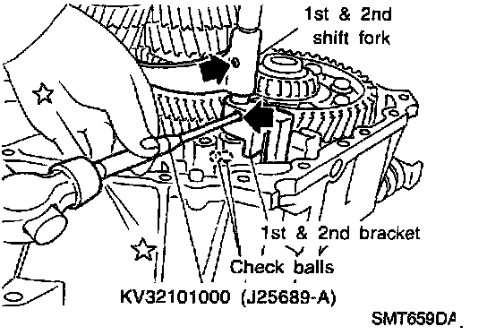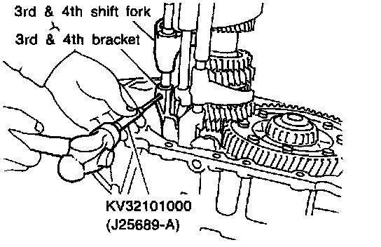 14. Remove retaining pin for 1st & 2nd shift fork and bracket using Tool.