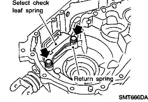 25. Remove reamer bolts, then remove select check leaf spring, return spring, steel ball, reverse gate, selector arm, bearing, and bushing.
