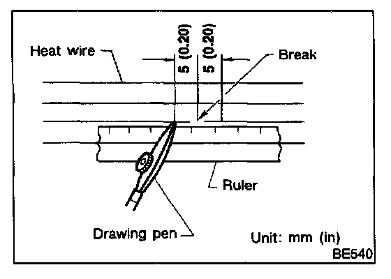 3. Place ruler on glass along broken line. Deposit conductive silver composition on break with drawing pen. Slightly overlap existing heat wire on both sides [preferably 5 mm (0.20 in)] of the break.