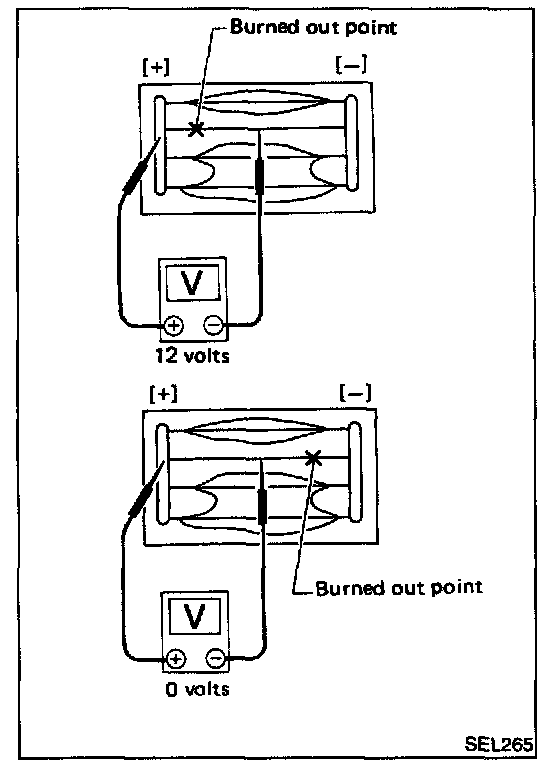 2. If a filament is burned out, circuit tester registers 0 or 12 volts.
