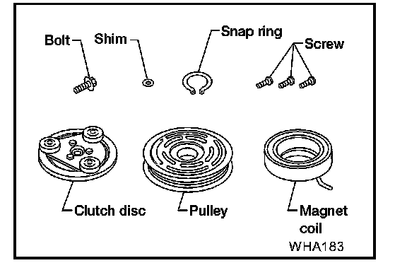 Check the appearance of the pulley assembly. If contact surface of pulley shows signs of excessive grooving, replace clutch disc and pulley. The contact surfaces of the pulley assembly should be cleaned with a suitable solvent before reinstallation.