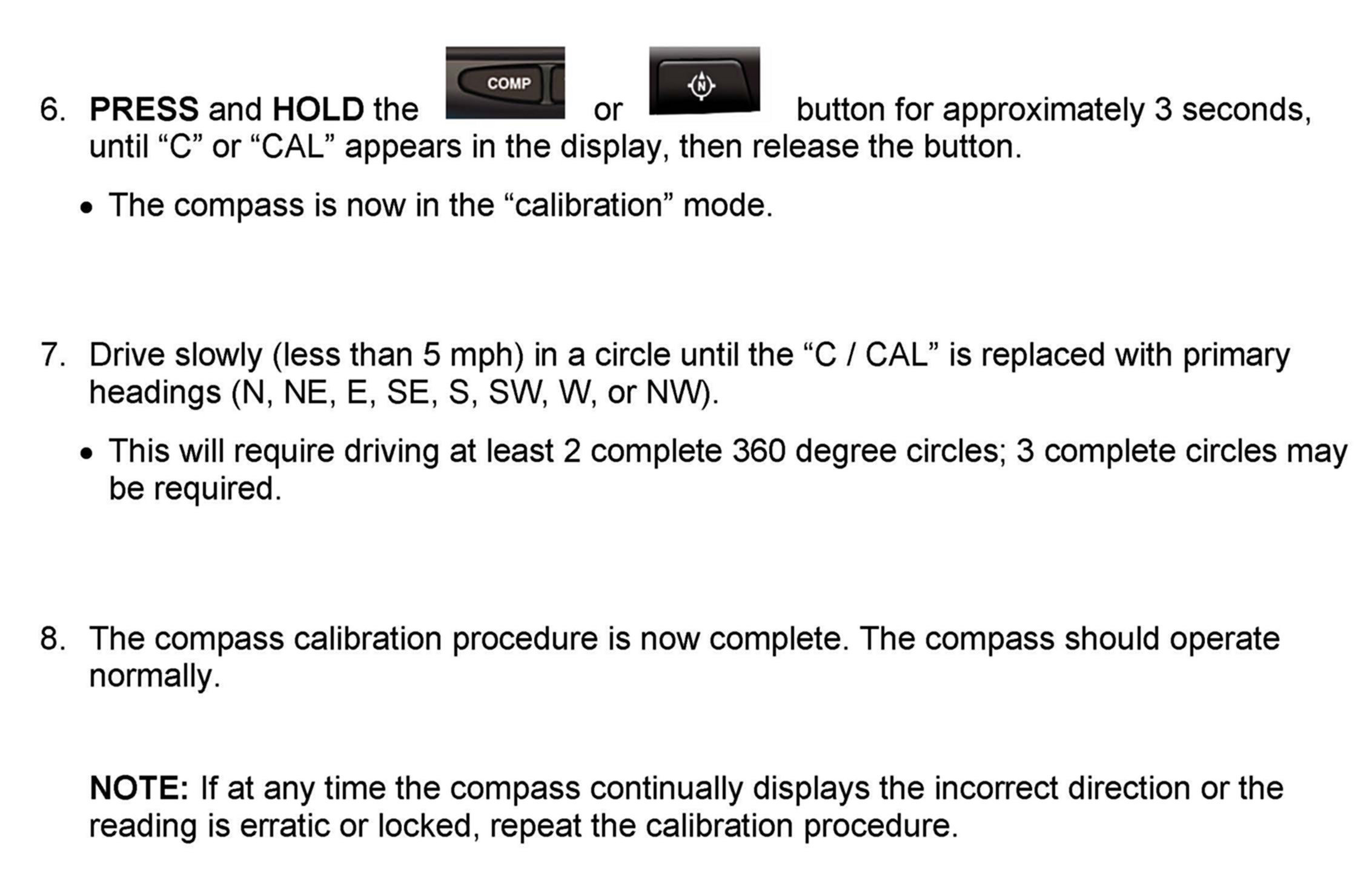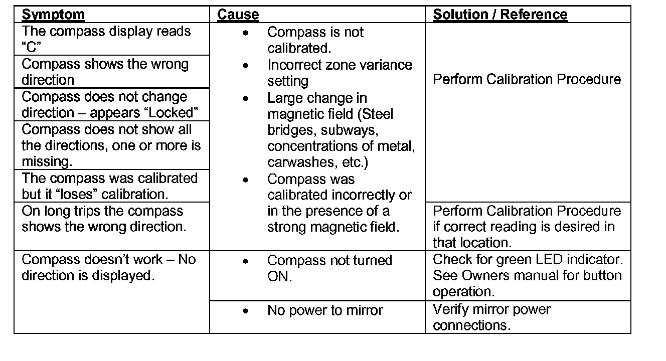 ^ During normal operation, the Compass Mirror will continuously update the compass calibration to adjust for gradual changes in the vehicle's magnetic 'remnant" field. If the vehicle is subjected to high magnetic influences, the compass may appear to indicate false headings, become locked, or appear that it is unable to be calibrated. If this occurs, perform the calibration procedure.