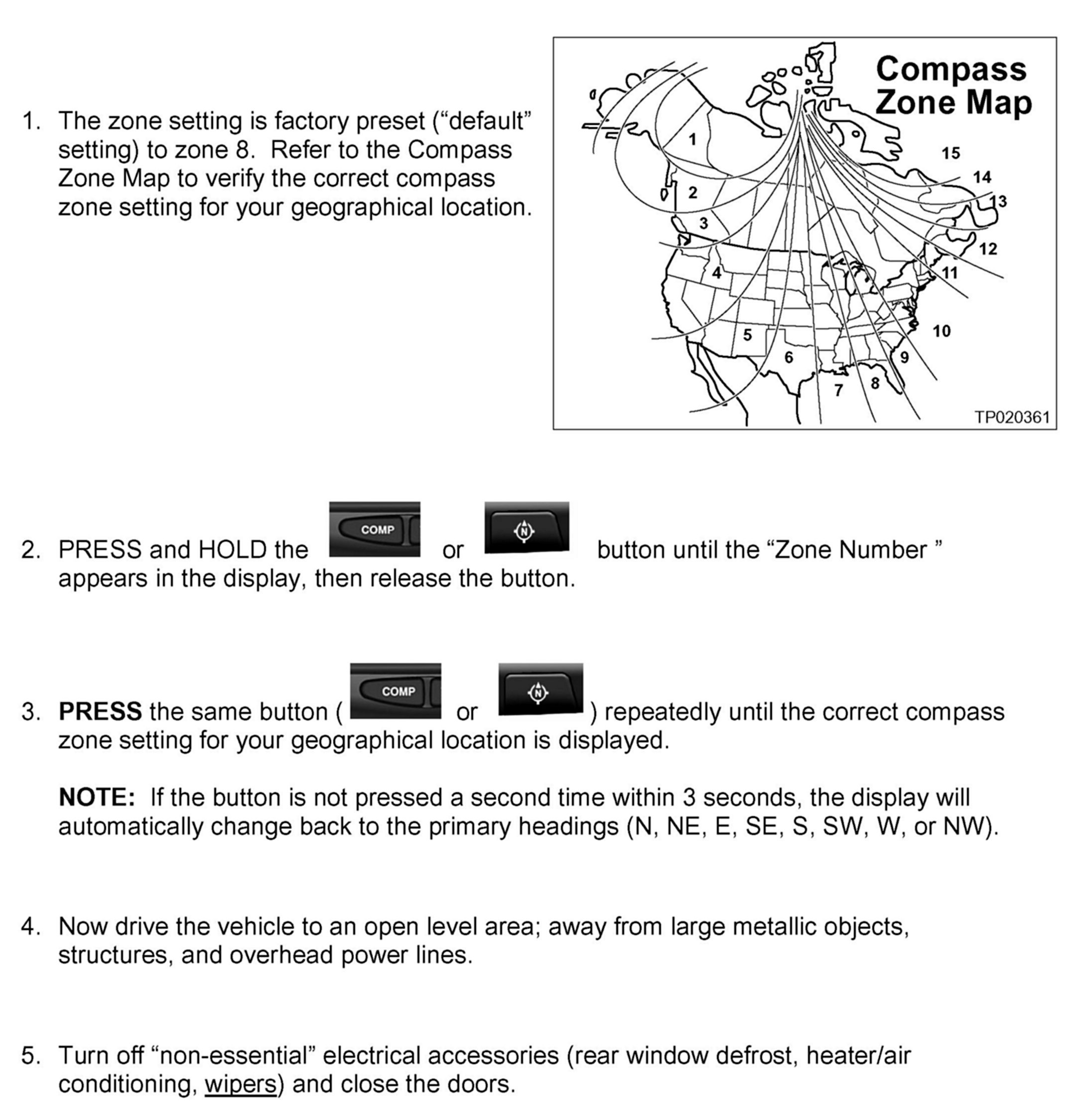 ^ On long trips, a vehicle may leave its original zone and enter one or more new zones. Generally, you do not need to reset the compass zone if you travel between 3 or 4 zones, such as business travel or vacation. The typical driver will not notice any difference on the display within 3 or 4 zones. However, if the vehicle is "permanently" moved to a new location, it is recommended that the compass zone be reset.