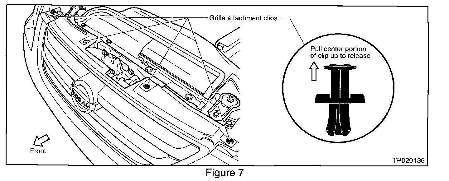 A. Remove four upper grille clips by pulling up on the center portion of each clip to release them (see Figure 7).