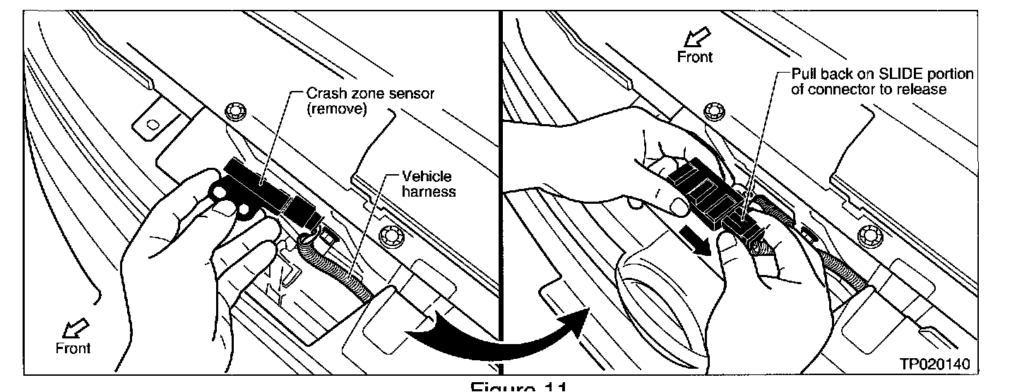 13. Carefully lift the sensor out and disconnect it from the vehicle harness by pulling back on the SLIDE portion of the connector (see Figure 11).