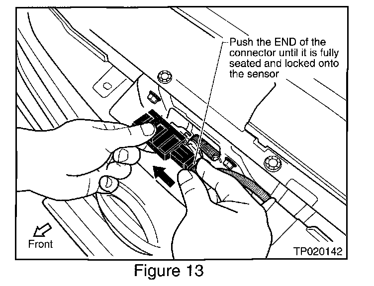 A. Re-connect the vehicle harness to the new crash zone sensor by pushing the END of the connector until it is fully seated and locked onto the sensor (see Figure 13).