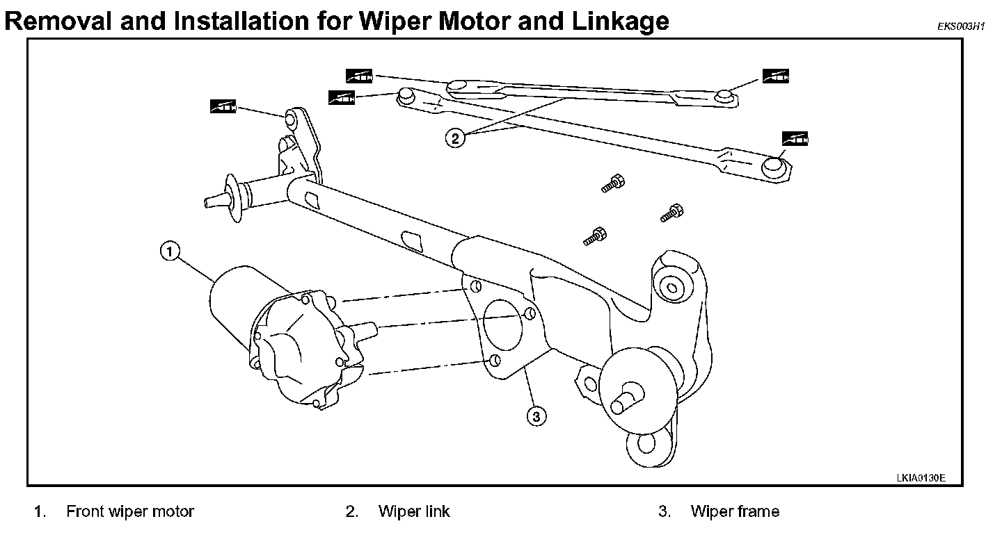 Wiper motor assembly bolts : 3.8 - 5.1 N.m (0.39 - 0.52 kg-m, 33.9 - 45.1 in-lb)