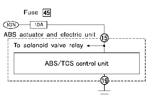 Check 10A fuse 45 (Engine control) for ABS actuator and electric unit (control unit). Refer to "POWER SUPPLY ROUTING CIRCUIT".