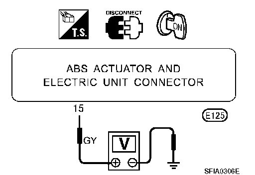 2. Check voltage between ABS actuator and electric unit (control unit) connector terminal 15 and ground. Does battery voltage exist when ignition switch is turned ON?