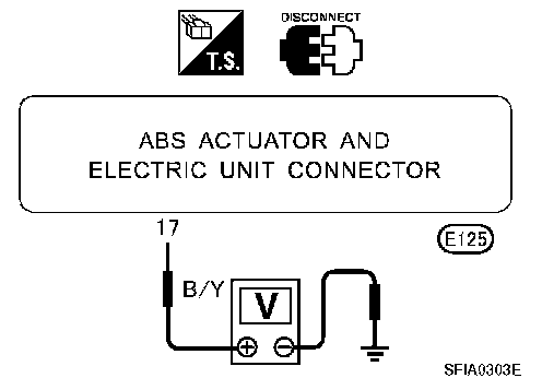 2. Check voltage between ABS actuator and electric unit (control unit) connector terminal 17 and ground. Does battery voltage exist?