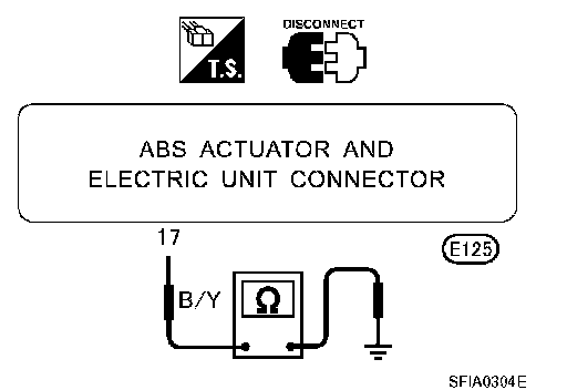 2. Check continuity between ABS actuator and electric unit (control unit) connector terminal 17 and ground.