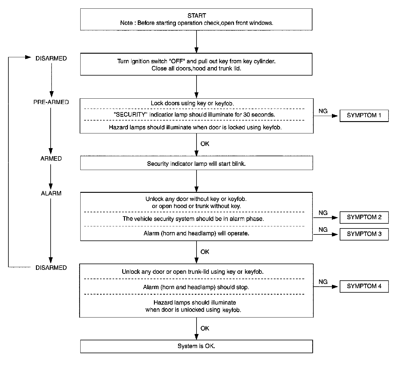The system operation is canceled by turning ignition switch to "ACC" at any step between START and ARMED in the flow chart.