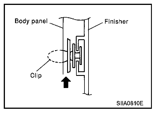 CAUTION: Insert screw driver rolled with cloth between panel on vehicle and clips (as indicated with arrow), and disconnect clips.