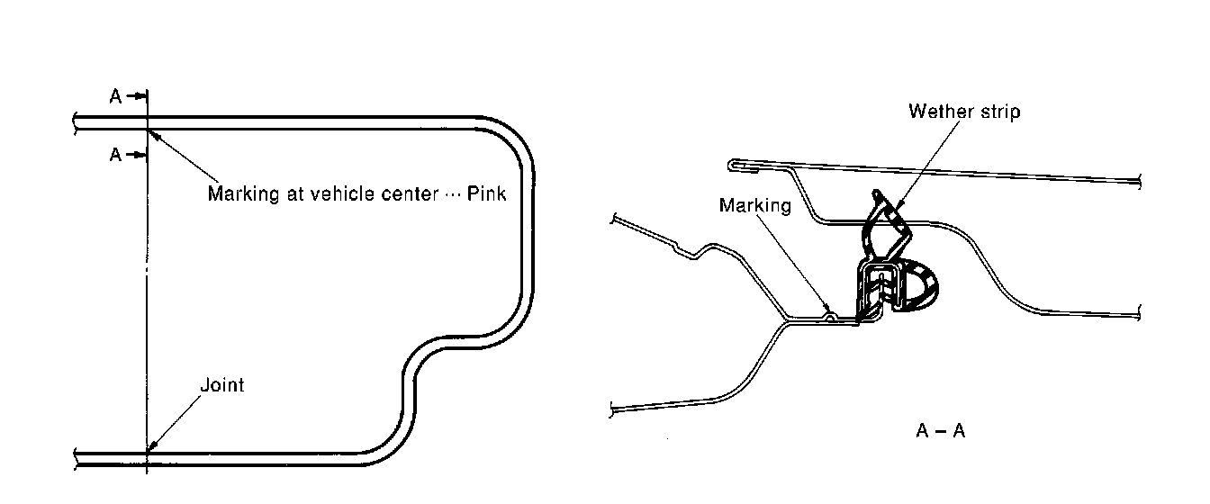 1. Install the weatherstrip from the front with the vehicle center mark aligned to the weatherstrip mark.