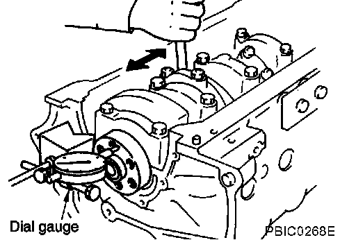 CRANKSHAFT SIDE CLEARANCE^ Using a dial gauge, measure the clearance between the thrust bearings and the crankshaft arm when the crankshaft is moved fully forward or backward.