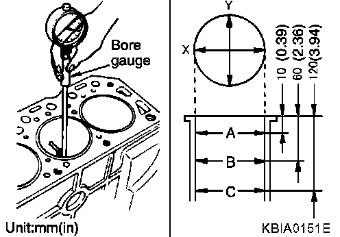 ^ Using a bore gauge, measure cylinder bore for wear, out-of-round and taper at 6 different points on each cylinder. (X and Y directions at A, B and C). The Y axis is in the longitudinal direction of the engine.