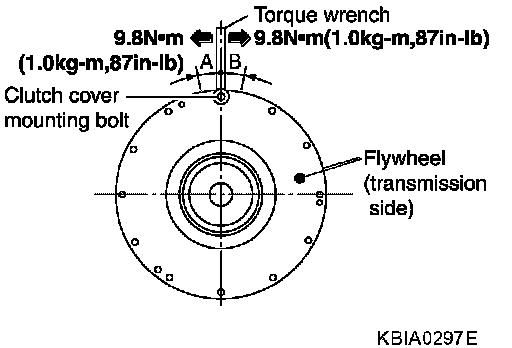 1. Install a bolt to clutch cover mounting hole, and place a torque wrench on the extended line of the flywheel center line.