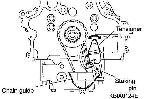 NOTE: Chain guide and tensioner move freely with the caulking pin as the axle. Therefore, bolt hole position of the three points could be changed during removal. If points change, temporarily fix the two mounting bolts on the chain guide and move the tensioner to match the bolt holes.