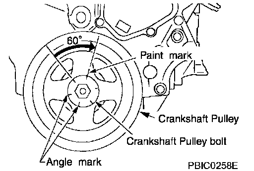 Crankshaft pulley bolt initial tightening: 37.3 - 47.1 Nm (3.8 - 4.8 kg-m, 28 - 34 ft. lbs.)
