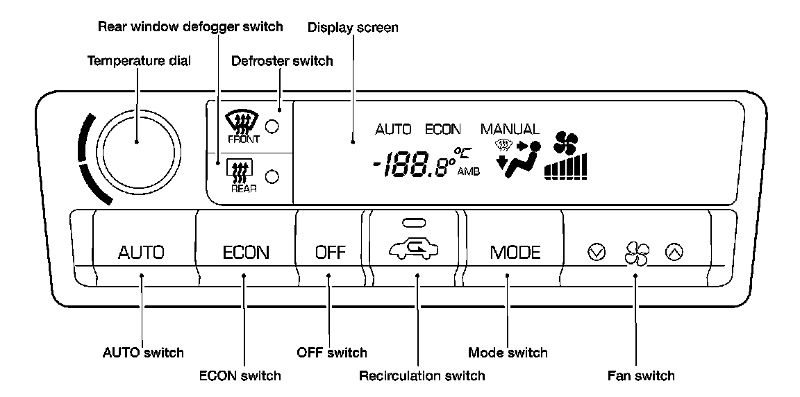 By pressing the ECON switch, the display screen should indicate ECON and the compressor always turns OFF. With the compressor OFF, the system will not remove heat (cool) or de-humidify. The system will maintain the in-vehicle temperature at the set temperature when the set the temperature is above the ambient (outside) temperature. The system will set the intake doors to the outside air position.