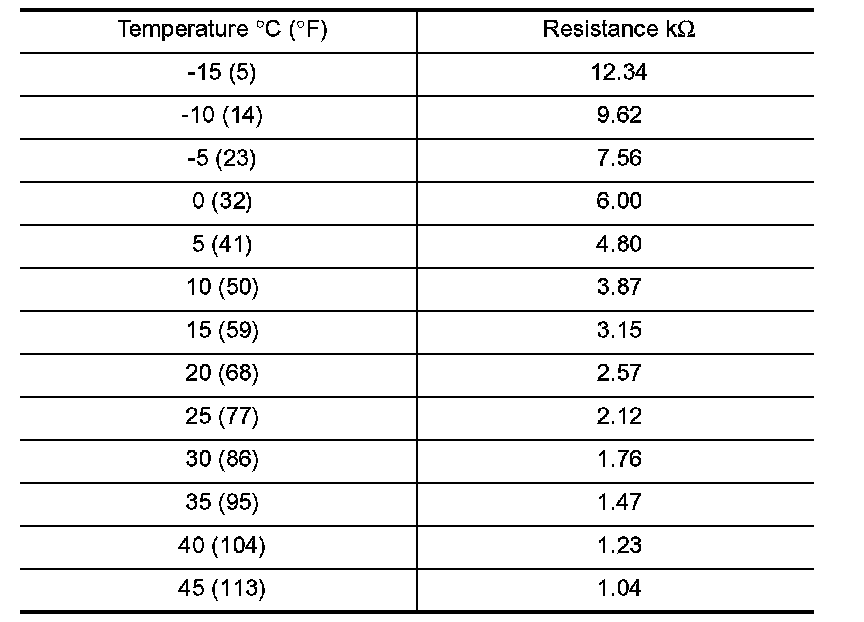 After disconnecting intake sensor harness connector, measure resistance between terminals 1 and 2 at sensor harness side, using the table.