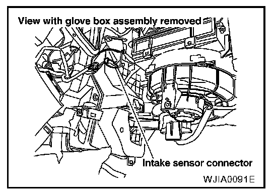 The intake sensor is located on the heater and cooling unit. It converts temperature of air after it passes through the evaporator into a resistance value which is then input to the auto amp.