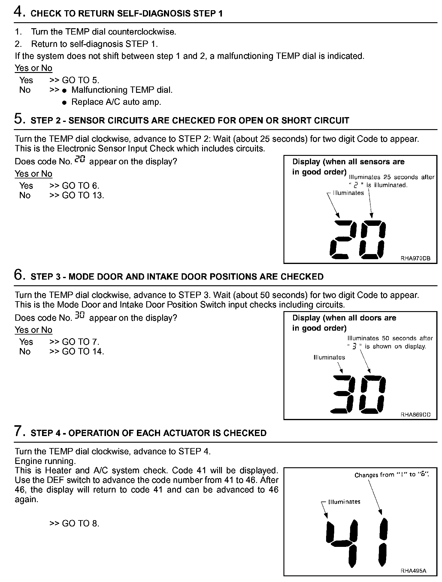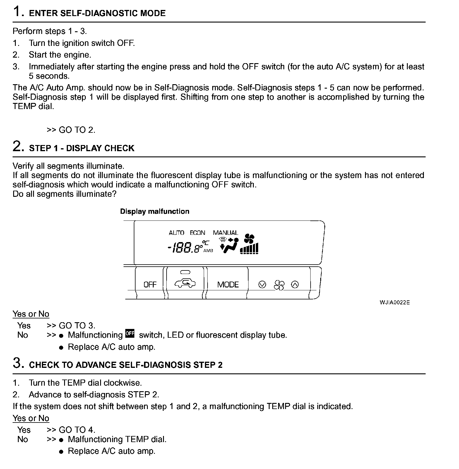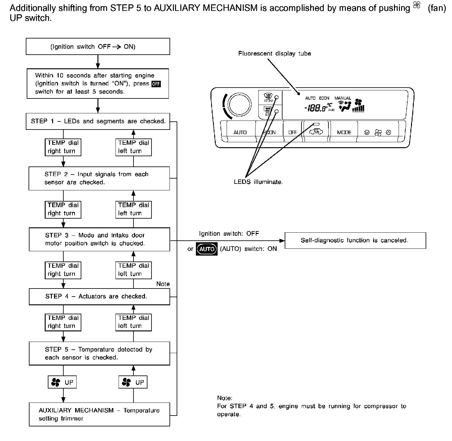 DESCRIPTIONThe self-diagnostic system diagnosis sensors, door motors, blower motor, etc. by system line. Refer to applicable sections (items) for details. Shifting from normal control to the self-diagnostic system is accomplished by starting the engine (turning the ignition switch from "OFF" to "ON") and pressing "OFF" switch for at least 5 seconds. The "OFF" switch must be pressed within 10 seconds after starting the engine (ignition switch is turned "ON"). This system will be canceled by either pressing "AUTO" (AUTO) switch or turning the ignition switch "OFF". Shifting from one step to another is accomplished by means of turning TEMP dial right or left, as required.