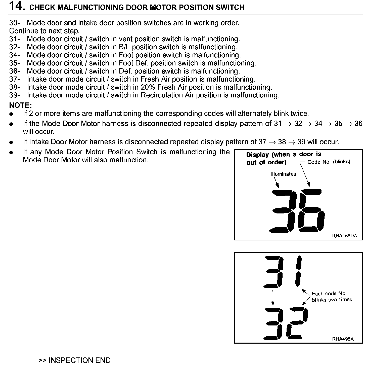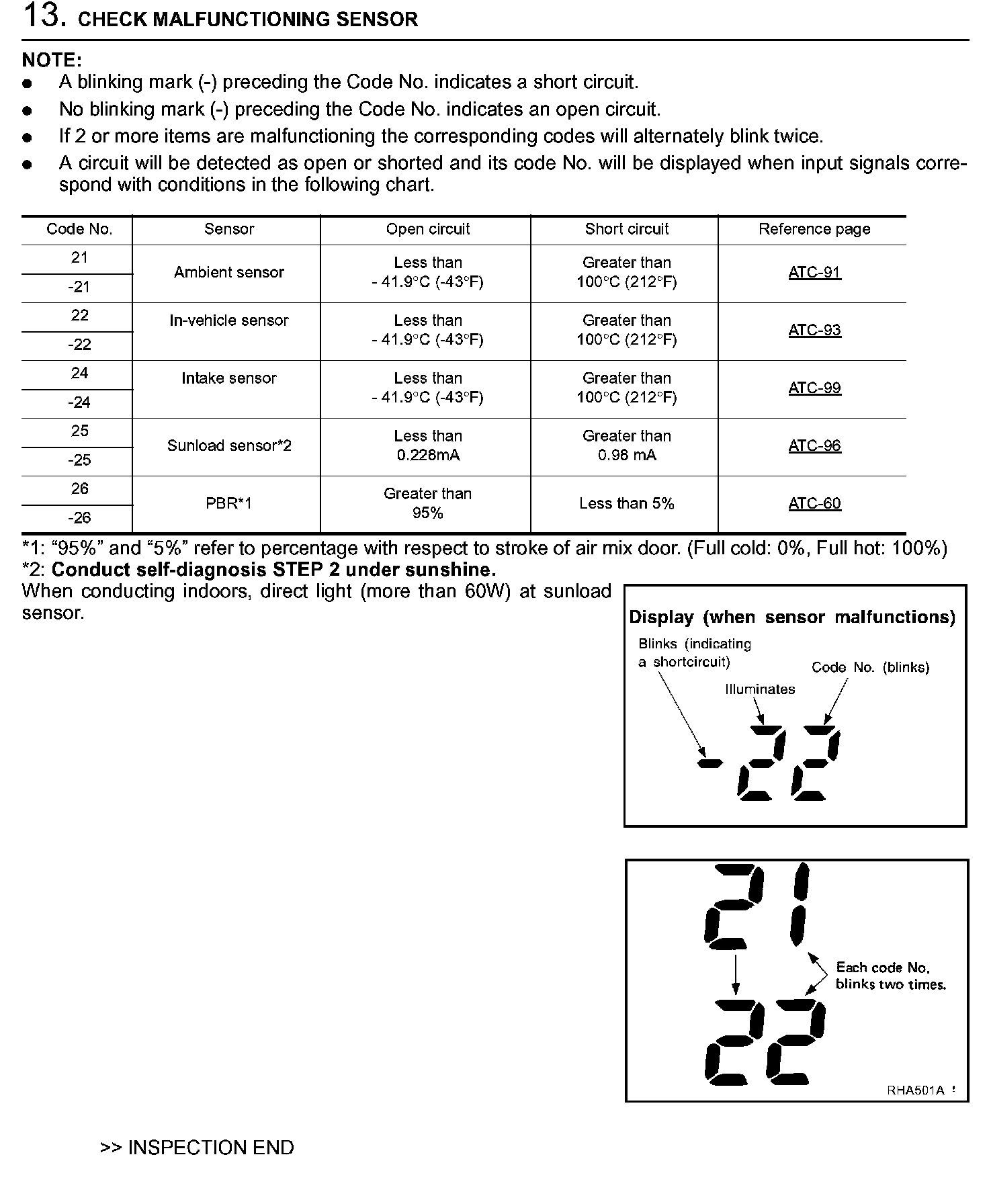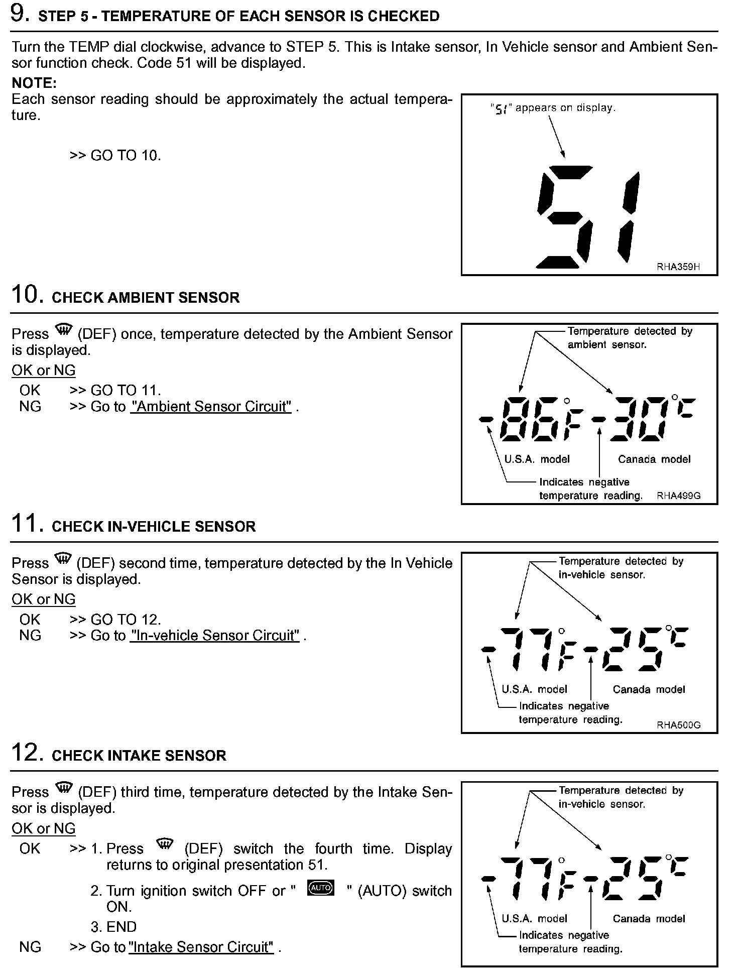 DESCRIPTIONThe self-diagnostic system diagnosis sensors, door motors, blower motor, etc. by system line. Refer to applicable sections (items) for details. Shifting from normal control to the self-diagnostic system is accomplished by starting the engine (turning the ignition switch from "OFF" to "ON") and pressing "OFF" switch for at least 5 seconds. The "OFF" switch must be pressed within 10 seconds after starting the engine (ignition switch is turned "ON"). This system will be canceled by either pressing "AUTO" (AUTO) switch or turning the ignition switch "OFF". Shifting from one step to another is accomplished by means of turning TEMP dial right or left, as required.