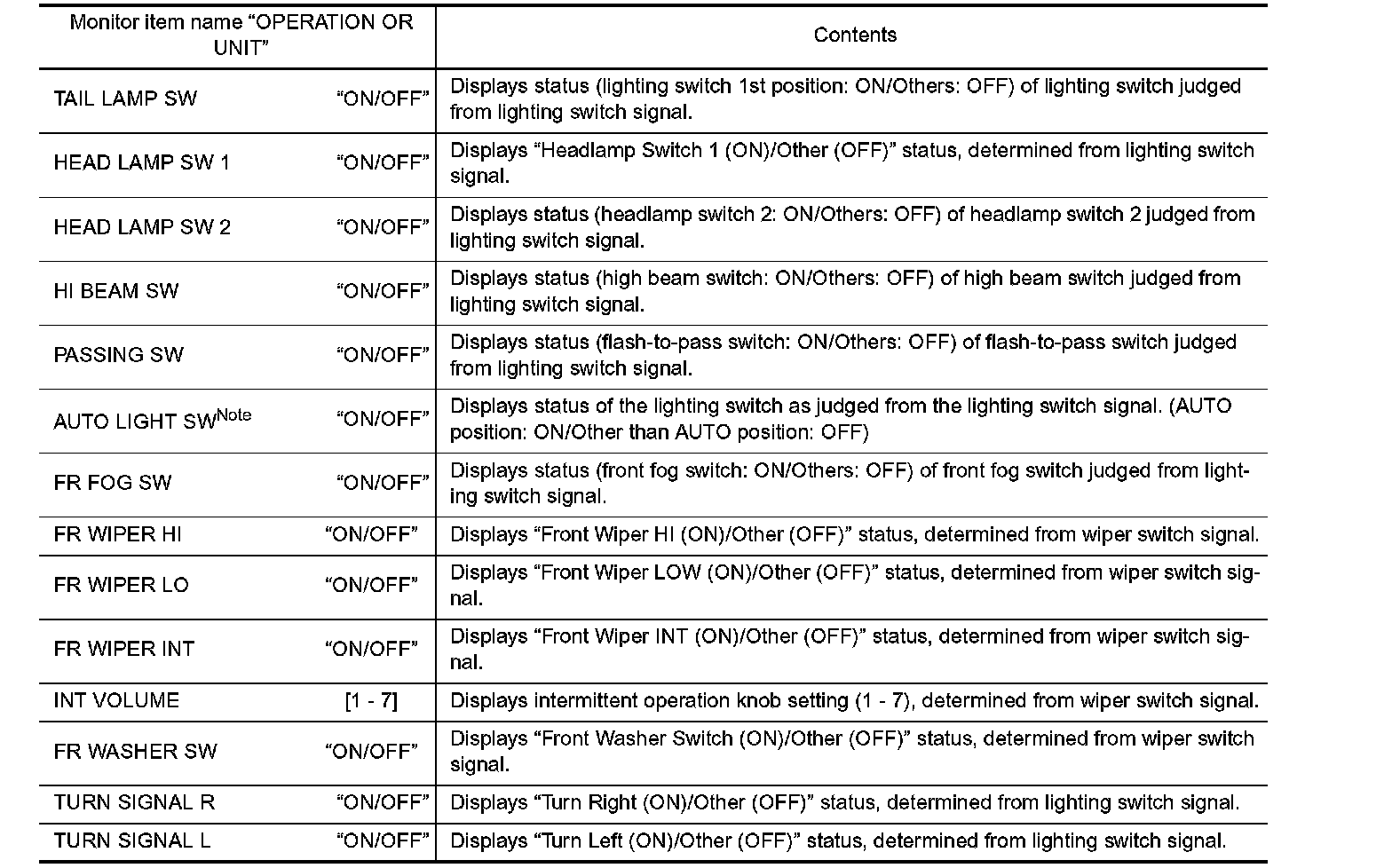 NOTE: For vehicles without auto light, item will be displayed but monitoring is not possible.
