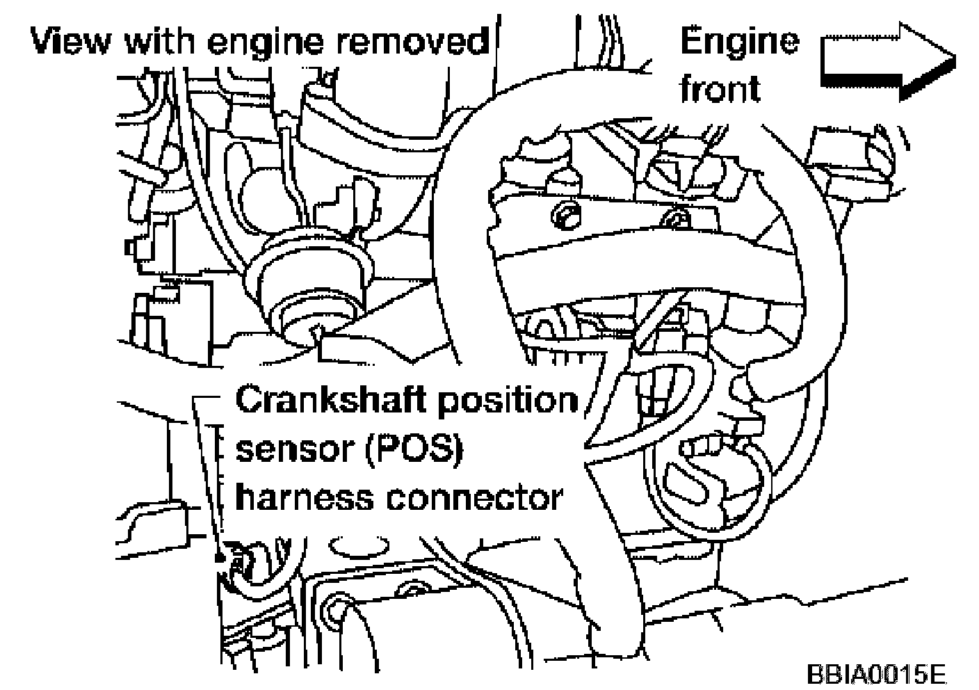 The crankshaft position sensor (POS) is located on the cylinder block rear housing facing the gear teeth (cogs) of the signal plate at the end of the crankshaft.