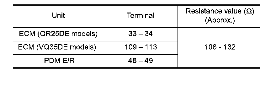 - Check resistance between ECM terminals 33 and 34 (QR25DE models).
