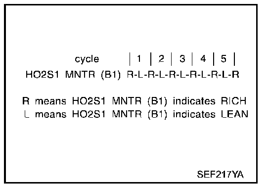 - "HO2S1 MNTR (B1)" in "DATA MONITOR" mode changes from "RICH" to "LEAN" to "RICH" 5 times in 10 seconds. 5 times (cycles) are counted as shown.