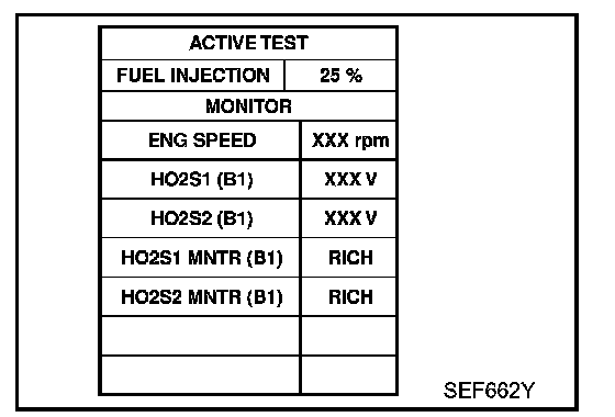 3. Select "FUEL INJECTION" in "ACTIVE TEST" mode, and select "HO2S2 (B1)" as the monitor item with CONSULT-II.
