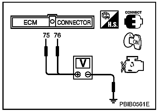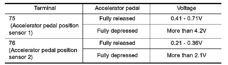 3. Check voltage between ECM terminals 75 (APP sensor 1 signal), 76 (APP sensor 2 signal) and engine ground under the above conditions.