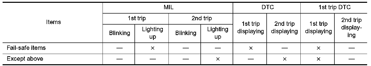 If the same malfunction is detected again during the next drive, the DTC and Freeze Frame data are stored in the ECM memory, and the MIL lights up. The MIL lights up at the same time when the DTC is stored. <2nd trip> The "trip" in the "Two Trip Detection Logic" means a driving mode in which self-diagnosis is performed during vehicle operation. Specific on board diagnostic items will cause the ECM to light up or blink the MIL, and store DTC and Freeze Frame data, even in the 1st trip as shown.