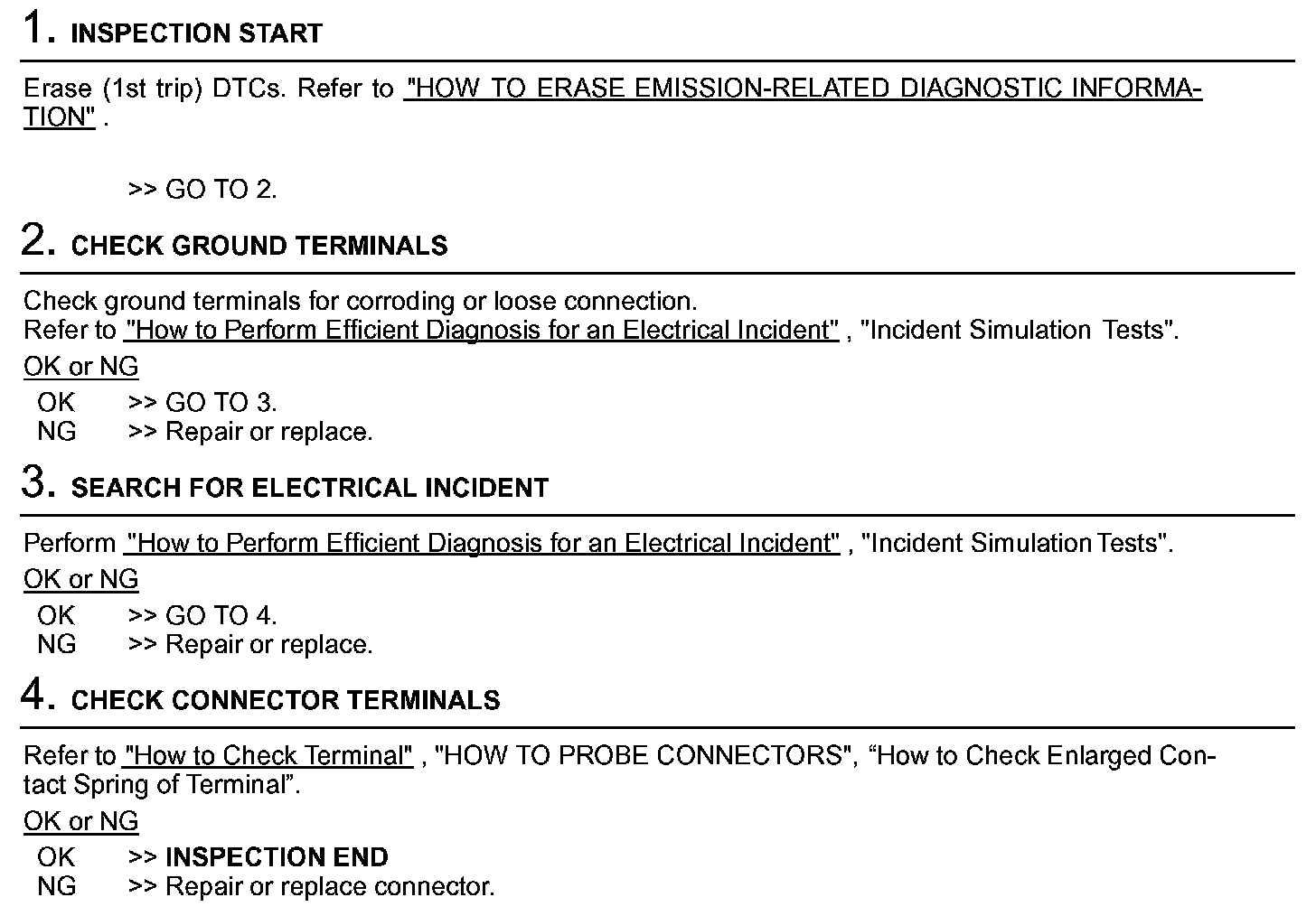 DescriptionIntermittent incidents (I/I) may occur. In many cases, the problem resolves itself (the part or circuit function returns to normal without intervention). It is important to realize that the symptoms described in the customers complaint often do not recur on (1st trip) DTC visits. Realize also that the most frequent cause of I/I occurrences is poor electrical connections. Because of this, the conditions under which the incident occurred may not be clear. Therefore, circuit checks made as part of the standard diagnostic procedure may not indicate the specific problem area.