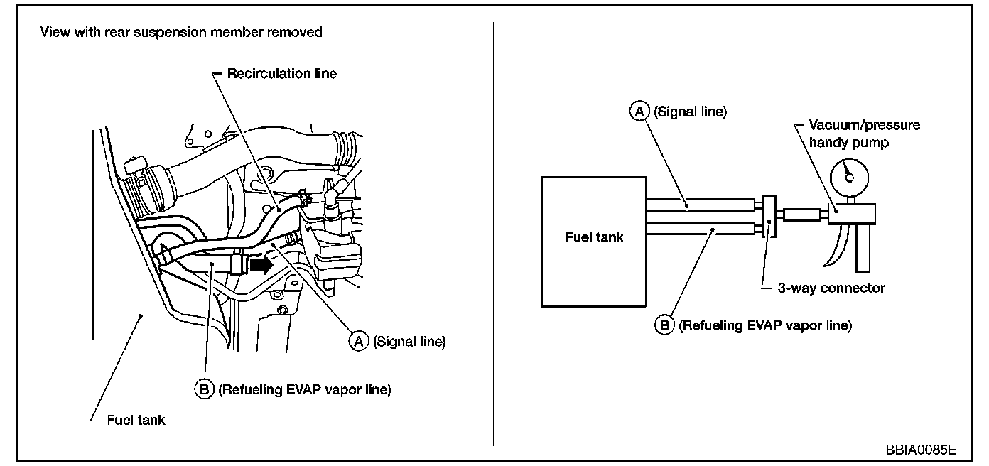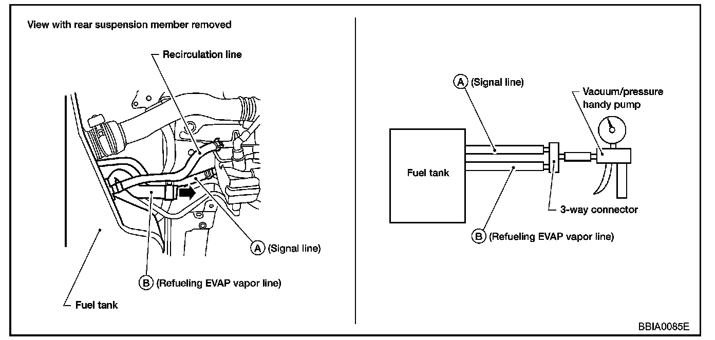 Blow air into the refueling EVAP vapor cut valve (from hose end B), and check that the air flows freely into the tank.