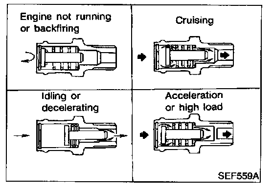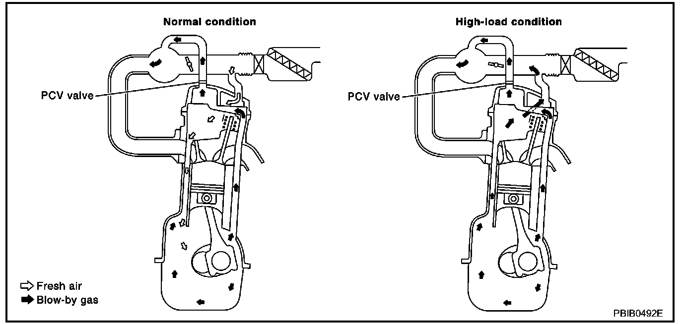 The positive crankcase ventilation (PCV) valve is provided to conduct crankcase blow-by gas to the intake manifold. During partial throttle operation of the engine, the intake manifold sucks the blow-by gas through the PCV valve. Normally, the capacity of the valve is sufficient to handle any blow-by and a small amount of ventilating air. The ventilating air is then drawn from the air inlet tubes into the crankcase. In this process the air passes through the hose connecting air inlet tubes to rocker cover. Under full-throttle condition, the manifold vacuum is insufficient to draw the blow-by flow through the valve. The flow goes through the hose connection in the reverse direction.