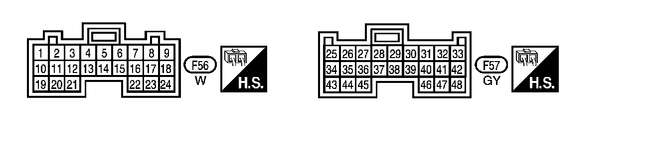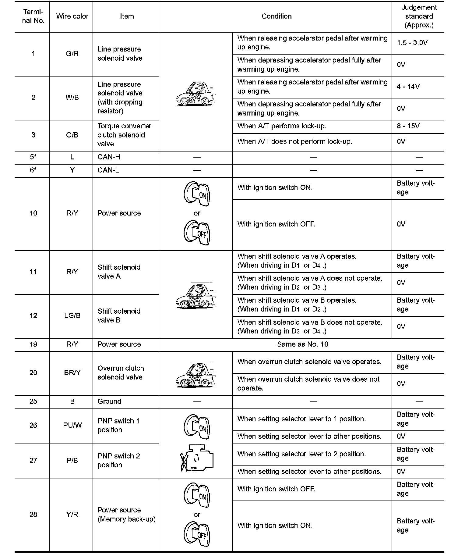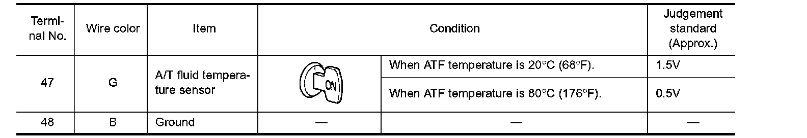 ^ Measure voltage between each terminal and terminal 25 or 48 by following "TCM INSPECTION TABLE".