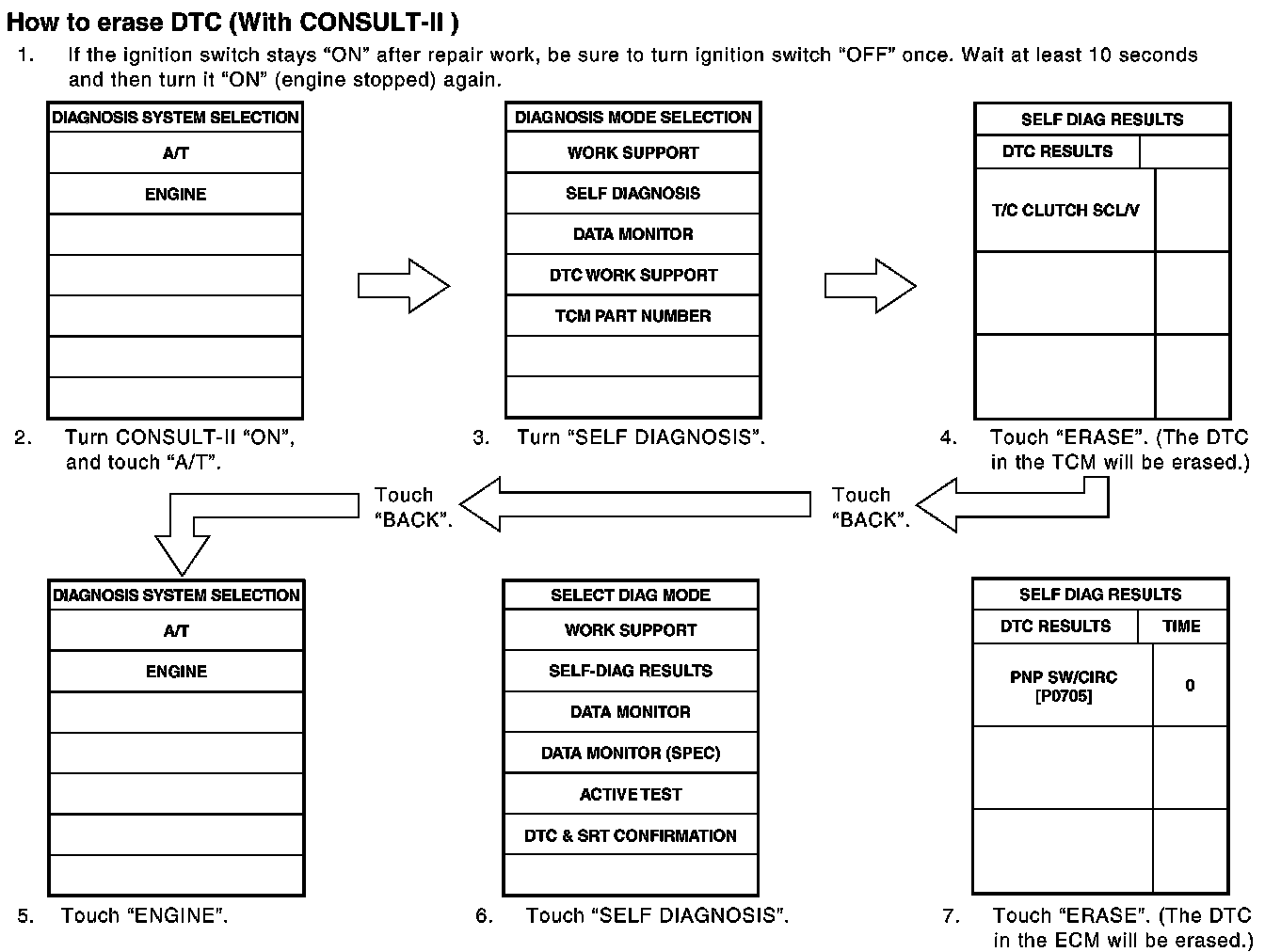 HOW TO ERASE DTCThe diagnostic trouble code can be erased by CONSULT-II, GST or ECM DIAGNOSTIC TEST MODE as described following.