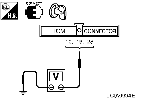 2. Check voltage between TCM terminals 10 (R/Y), 19 (R/Y), and 28 (Y/R) and ground.