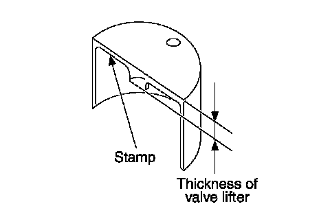 ^ Thickness of a new valve lifter can be identified by stamp marks on the reverse side (inside the cylinder). Stamp mark 696 indicates a thickness of 6.96 mm (0.2740 inch) Available thickness of valve lifter: 26 sizes with a range of 6.96 to 7.46 mm (0.2740 to 0.2937 inch), in steps of 0.02 mm (0.0008 inch), when assembled at the factory.