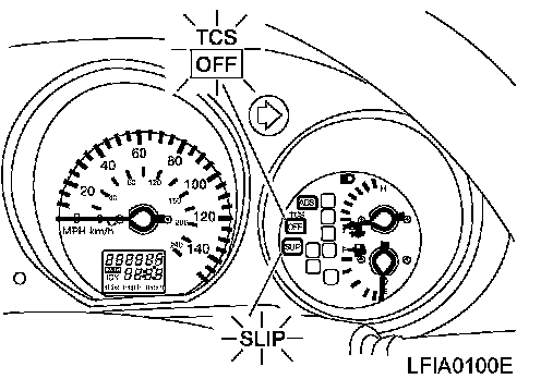 Drive wheel slippage is detected by the 4-wheel rotating speed signal. When the wheel slip becomes excessive, the TCS operates, causing the SLIP indicator lamp to flash. At the same time, a fuel-cut signal to be sent to the ECM and a signal requiring a change in the shift schedule is sent to the TCM. When the TCS OFF switch is used to cancel TCS function, the TCS OFF indicator lamp will light. (TCS does not activate.) In case of a malfunction in the TCS, both the SLIP indicator lamp and the TCS OFF indicator lamp will light, while shutting down the TCS system operation. The vehicle will operate in the same way as a vehicle not equipped with TCS.