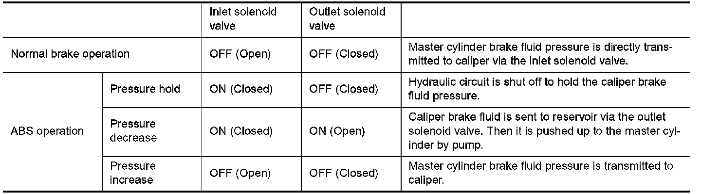 These components control the hydraulic circuit. The ABS actuator and electric unit (control unit) directs the actuator to increase, hold or decrease hydraulic pressure to all or individual wheels. The ABS actuator and control unit (control unit) cannot be disassembled and must be replaced as an assembly.